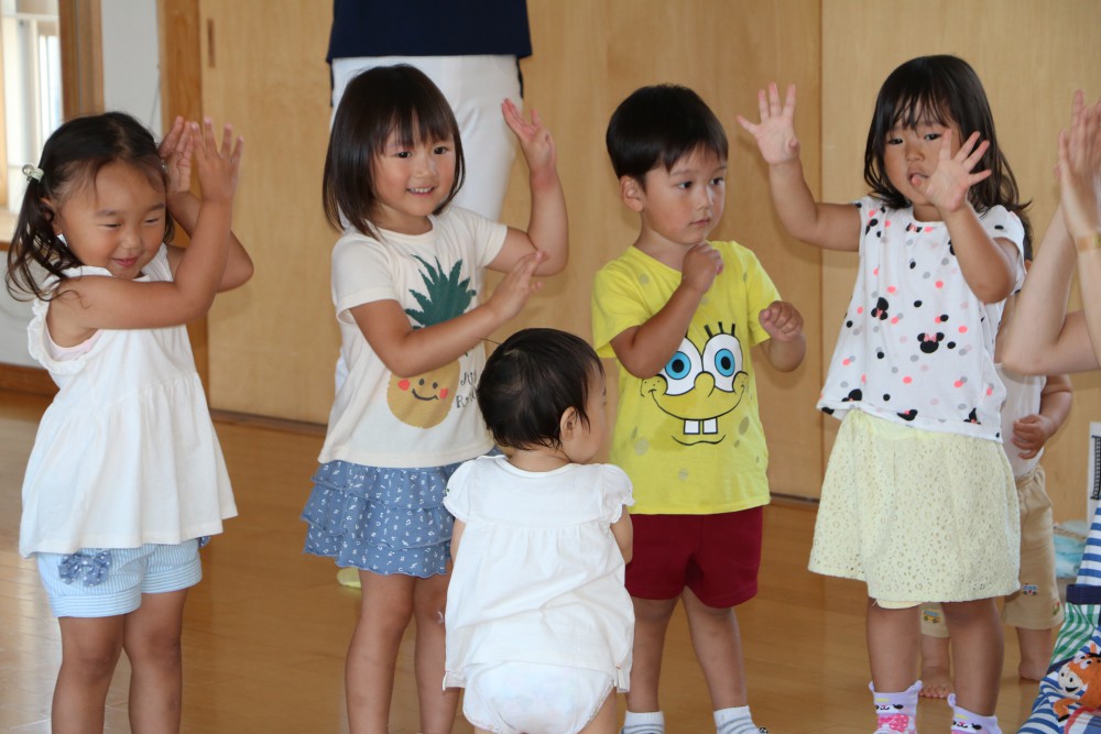 終わりの会では、年長さんと今日来てくれた在園児がいるおうちのお友だちに協力してもらって手遊び!(^^)!